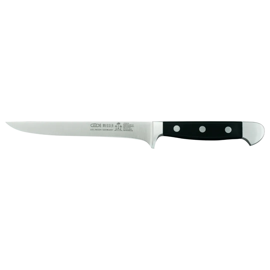 Der feinpolierte Griff aus robustem, pflegeleichtem Kunststoff bietet nicht nur einen sicheren Halt, sondern auch eine exzellente Balance für komfortables Arbeiten, selbst bei längeren Zubereitungen. Mit einer Gesamtlänge von 29,2 cm und einer Grifflänge von 11 cm ist das Güde Alpha Ausbeinmesser nicht nur funktional, sondern auch langlebig. Es ist das ideale Werkzeug für sowohl ambitionierte Hobbyköche als auch Profis, die ihre Zubereitungserlebnisse auf ein neues Level heben möchten.