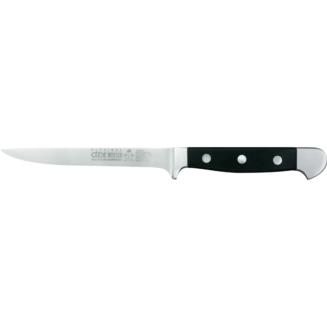 Das Alpha Ausbeinmesser Flexibel 13 cm von Güde ist der perfekte Begleiter für präzise Ausbeinaufgaben in jeder Küche. Mit einer 13 cm langen Klinge aus hochwertigem Chrom-Vanadium-Molybdän-Stahl bietet dieses Messer außergewöhnliche Schärfe und Haltbarkeit, während es absolut rostfrei ist. Die flexible Klinge mit einer Dicke von 1 mm und einer Höhe von 1,8 cm ermöglicht es Dir, mühelos um Knochen und Gelenke zu schneiden und saubere, professionelle Schnitte zu erzielen.