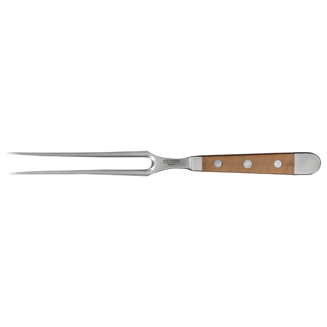 Die Güde Fleischgabel 18 cm aus der Serie Alpha Birne ist der perfekte Küchenhelfer für Fleischliebhaber. Mit ihrer robusten Bauweise und den handgeschmiedeten Zinken aus hochwertigem Chrom-Vanadium-Molybdän Messerstahl hält sie das Fleisch während des Tranchierens sicher in Position. Die Zinken sind nicht nur ideal zum Wenden, sondern auch zum einfachen Überprüfen des Garzustands. So gelingt dir jedes Stück Fleisch perfekt.