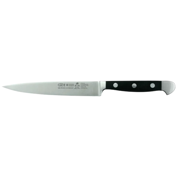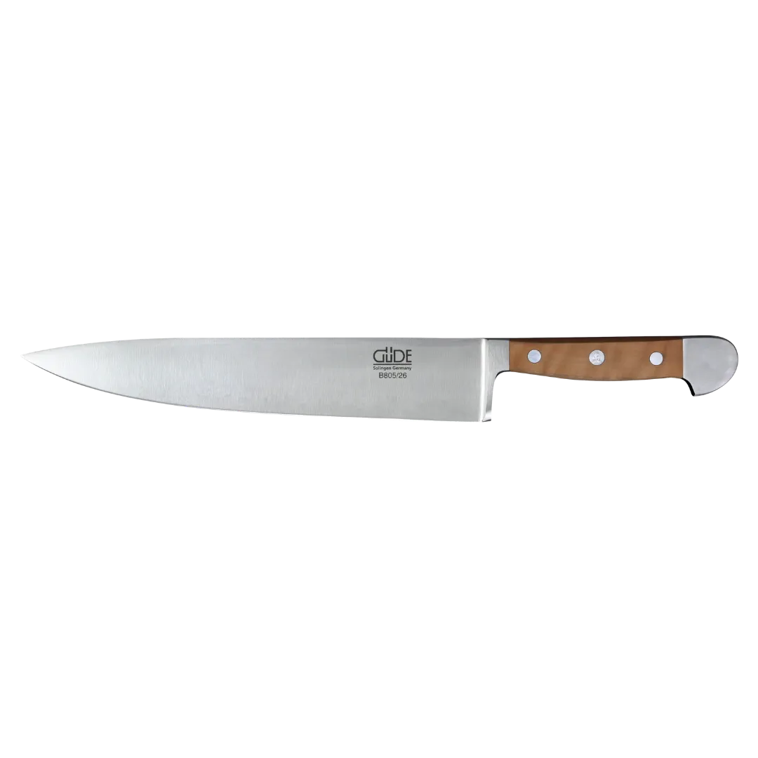 Das Alpha Birne Kochmesser 26cm von Güde ist dein perfekter Begleiter für präzise und kraftvolle Schnitte in der Küche. Mit einer Klingenlänge von 26 cm aus rostfreiem Chrom-Vanadium-Molybdän-Stahl überzeugt es durch herausragende Schärfe und Langlebigkeit. Die Klingendicke von 3,7 mm und die Klingenhöhe von 4,3 cm ermöglichen müheloses Schneiden, egal ob bei Fleisch, Gemüse oder Kräutern.