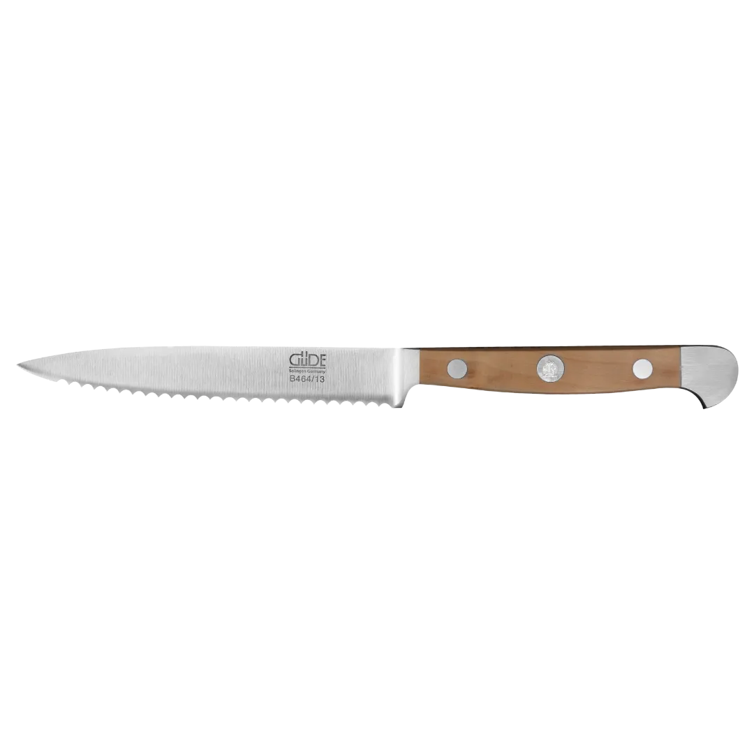 Das Alpha Birne Tomatenmesser 13 cm von Güde ist der ideale Küchenhelfer für jeden, der Wert auf Qualität und Präzision legt. Dank des feinen Wellenschliffs gleitet die handgeschmiedete Klinge mühelos durch die feste Haut von Tomaten, ohne das zarte Fruchtfleisch zu beschädigen. Dieses Messer ist jedoch nicht nur für Tomaten geeignet; es ist auch hervorragend zum Schneiden von Käse und Obst geeignet.