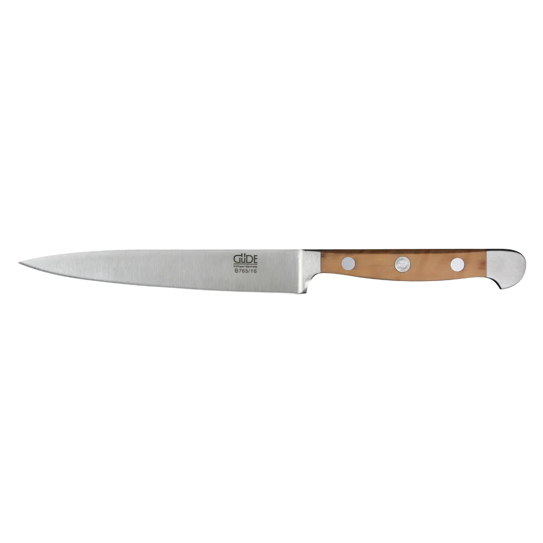 Das Alpha Birne Zubereitungsmesser von Güde mit einer 16 cm langen Klinge ist das unverzichtbare Allround-Messer für deine nachhaltige Küche. Die spitz zulaufende, handgeschmiedete Klinge aus hochwertigem Chrom-Vanadium-Molybdän Stahl sorgt für exzellente Schnitteigenschaften und präzise Kontrolle. Egal, ob du Gemüse schneidest, Obst vorbereitest oder Fleisch portionierst – dieses vielseitige Messer bietet dir stets optimale Ergebnisse. Die eisgehärtete, rostfreie Klinge garantiert Langlebigkeit, während der ergonomische Birnenholzgriff perfekt ausbalanciert ist und angenehm in der Hand liegt. Der Griff aus samtigem, feinpoliertem Holz verleiht dem Messer nicht nur eine edle Optik, sondern bietet auch optimalen Halt.
