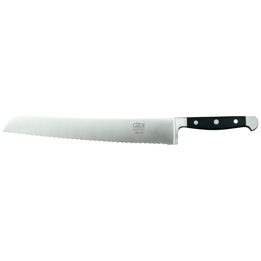 Das Alpha Brotmesser 32 cm von Güde ist der ideale Begleiter für alle, die gerne frisch gebackenes Brot genießen. Mit einer beeindruckenden Klingenlänge von 32 cm aus hochwertigem Chrom-Vanadium-Molybdän bietet dieses Messer nicht nur außergewöhnliche Schärfe, sondern ist auch rostfrei und langlebig. Die Klingendicke von 3,9 mm ermöglicht Dir müheloses Schneiden durch dicke Brote und Brötchen, während das Gewicht von 336 g für eine optimale Handhabung sorgt.