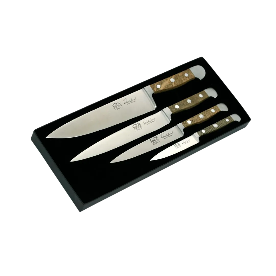 Das 4-teiliges Messerset “Alpha Fasseiche” von Güde ist die perfekte Kombination aus Funktionalität, Haltbarkeit und Eleganz. Mit handgeschmiedeten Klingen aus Chrom-Vanadium-Molybdän-Stahl, die rostfrei und eisgehärtet sind, bietet dieses Set höchste Präzision und Langlebigkeit. Die Griffe bestehen aus Fasseichenholz, das aus über 80 Jahre alten Weinfässern stammt, was ihnen außergewöhnliche Festigkeit und eine einzigartige Optik verleiht.