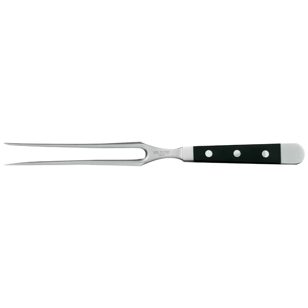 Die Güde Fleischgabel 18 cm aus der Serie Alpha ist dein unverzichtbarer Helfer bei der Fleischzubereitung. Mit ihren handgeschmiedeten, rostfreien Gabelzinken aus hochwertigem Chrom-Vanadium-Molybdän Messerstahl hält sie deinen Braten sicher an Ort und Stelle, während du ihn wendest oder tranchierst. So kannst du den perfekten Garzustand spielend leicht prüfen, und dein Fleisch bleibt während der Zubereitung optimal in Position.