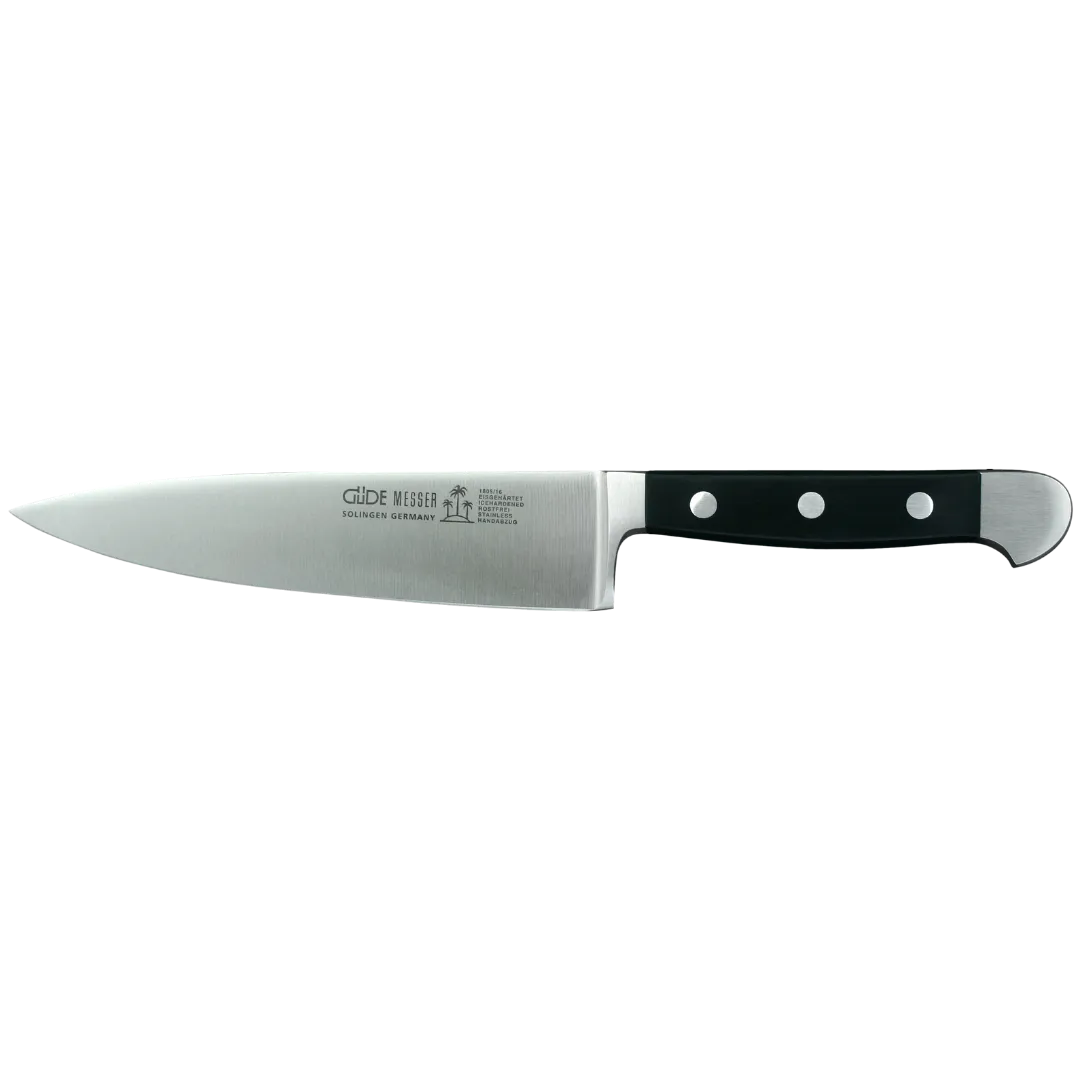 Das Alpha Kochmesser 16 cm von Güde ist der perfekte Begleiter für alle, die in der Küche auf Präzision und Komfort setzen. Mit seiner 16 cm langen, geschmiedeten Klinge aus Chrom-Vanadium-Molybdän-Stahl, die eisgehärtet ist und eine Härte von 56 HRC erreicht, bietet dieses Messer herausragende Schärfe und Langlebigkeit. Die 3,5 mm dicke Klinge mit einem doppelseitigen Schliff schneidet mühelos durch Fleisch, Gemüse und Kräuter.