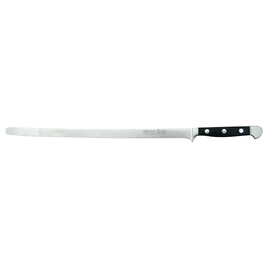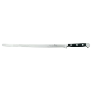 Das Güde Alpha Lachsmesser mit einer beeindruckenden 32 cm langen, schmalen Klinge ist das ideale Werkzeug, um Lachs und Schinken in hauchdünne Scheiben zu schneiden. Selbst große Stücke lassen sich mühelos und präzise portionieren, sodass du in deiner Küche wie ein Profi arbeiten kannst. Die handgeschmiedete Klinge aus Chrom-Vanadium-Molybdän Messerstahl ist eisgehärtet und bleibt extrem lange scharf.