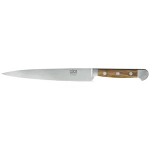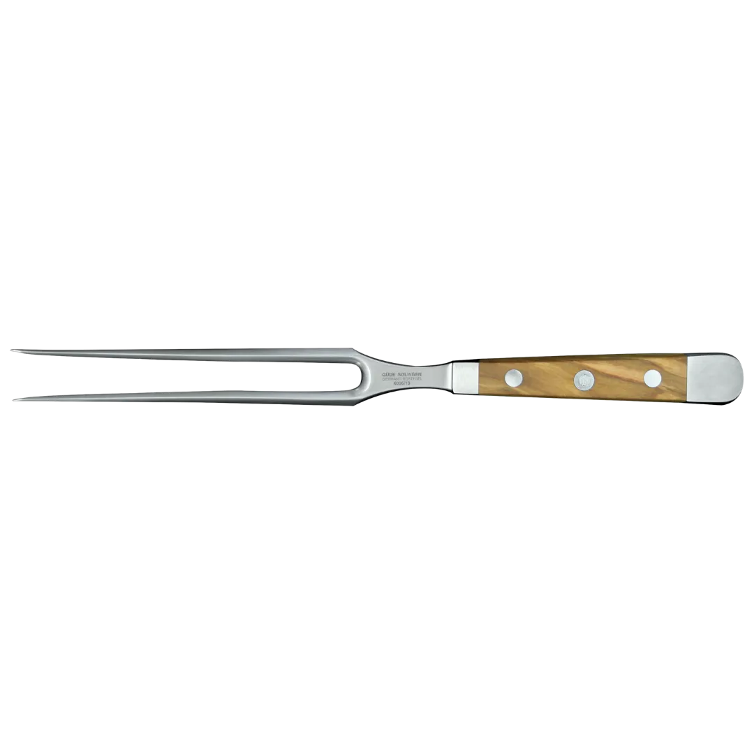 Die handgeschmiedete Gabel aus eisgehärtetem Chrom-Vanadium-Molybdän-Stahl vereint Schärfe und Langlebigkeit. Dank der feinen Politur des Griffs aus jahrhundertealtem Olivenholz liegt sie angenehm in der Hand und bietet eine optimale Balance. Die eleganten Nieten aus Edelstahl und Aluminium runden das Design stilvoll ab.