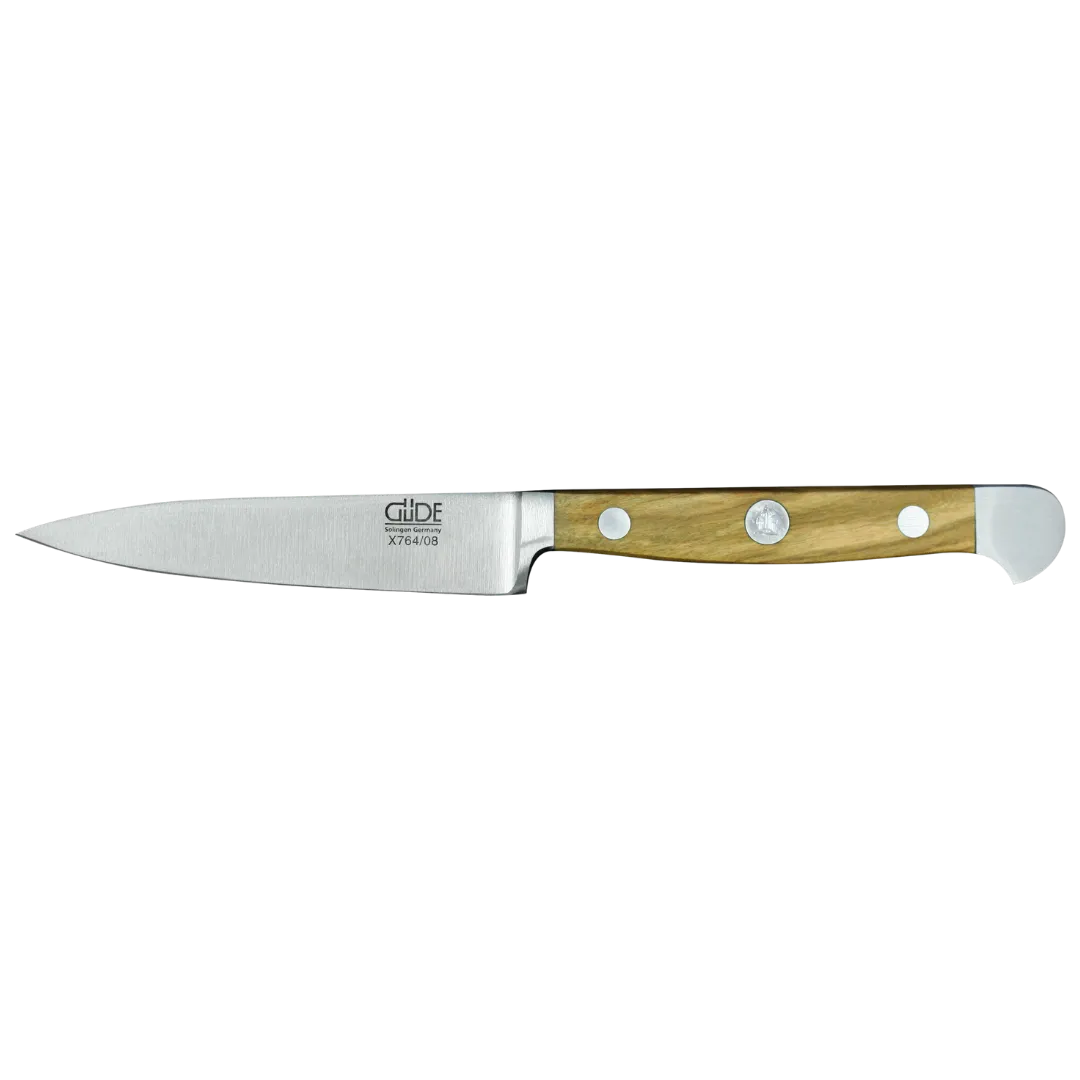 Das Güde Alpha Olive Spickmesser 8cm vereint Funktionalität und Eleganz für deine Küchenaufgaben. Mit seiner präzise spitz zulaufenden Klinge ist es perfekt zum Reinigen, Schälen und Schneiden von Früchten, Gemüse, Zwiebeln und Kräutern. Die handgeschmiedete Klinge aus Chrom-Vanadium-Molybdän-Stahl, ein Stück Edelstahl, ist eisgehärtet und von Hand geschärft, was außergewöhnliche Schärfe und Langlebigkeit garantiert.