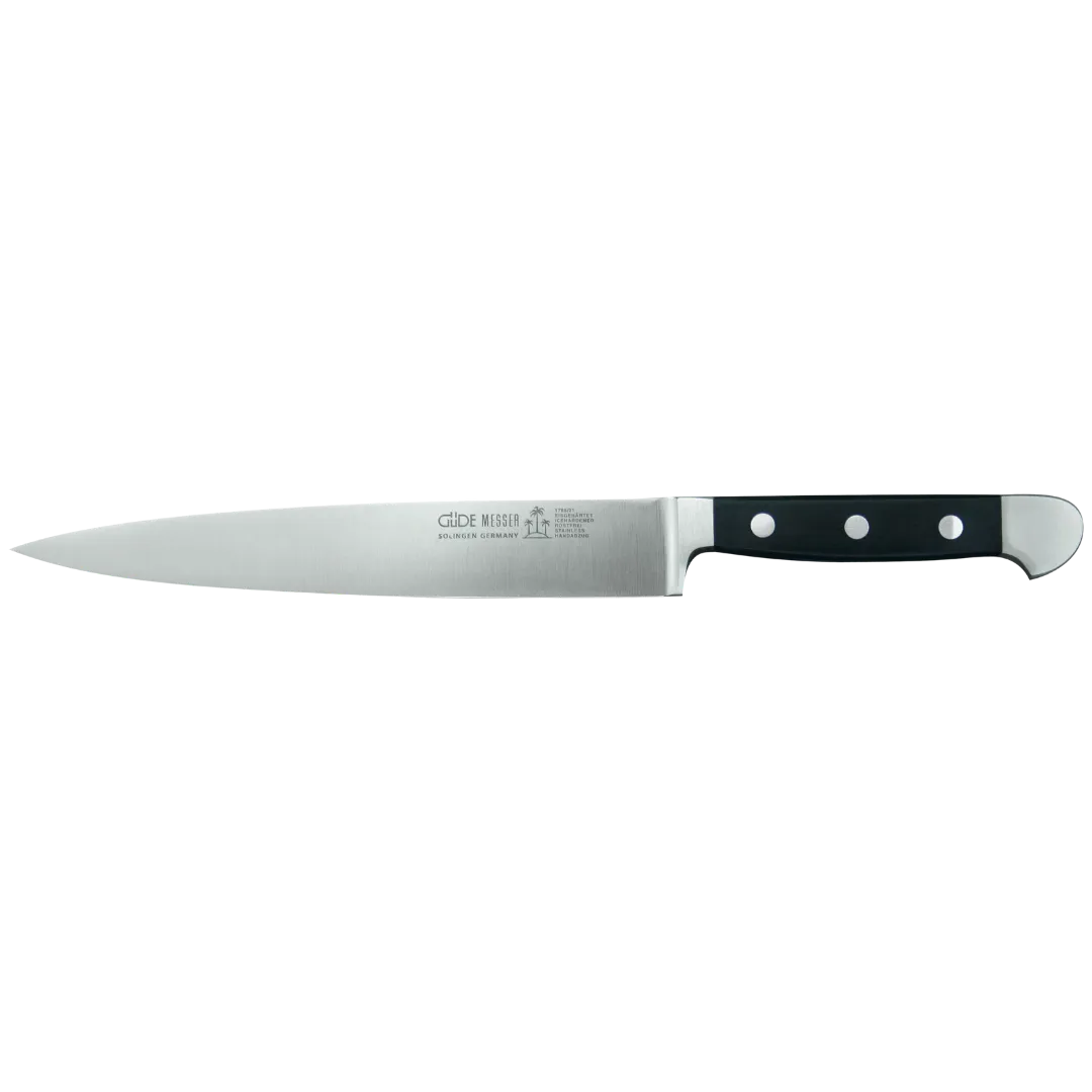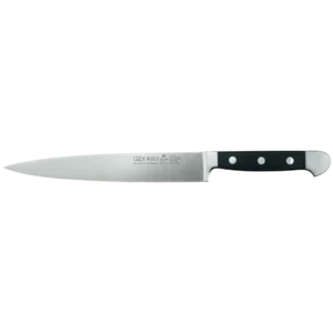 Das Güde Alpha Schinkenmesser 21 cm ist der ideale Begleiter für alle, die die Kunst des Schinkenschneidens meistern wollen. Mit einer Klingenlänge von 21 cm aus hochwertigem Chrom-Vanadium-Molybdän vereint dieses Messer außergewöhnliche Schärfe und Rostbeständigkeit. Der beidseitige Schliff und die Klingendicke von 2,3 mm ermöglichen Dir präzise, saubere Schnitte, die den vollen Geschmack des Schinkens zur Geltung bringen.