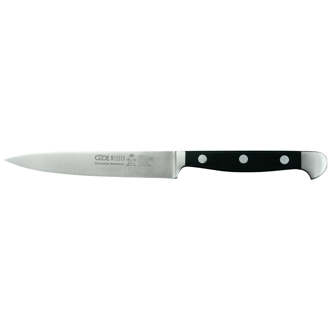 Das Alpha Spickmesser 13 cm von Güde ist das ideale Werkzeug für alle Vorbereitungsarbeiten in deiner nachhaltigen Küche. Mit seiner vielseitigen, mittelspitzen Klinge meisterst du mühelos das Reinigen, Schälen und Schneiden von Obst, Gemüse, Zwiebeln und Kräutern. Die handgefertigte Klinge aus hochwertigem Chrom-Vanadium-Molybdän-Stahl ist eisgehärtet und handgeschärft, wodurch sie eine bemerkenswerte Härte von 56 HRC erreicht.