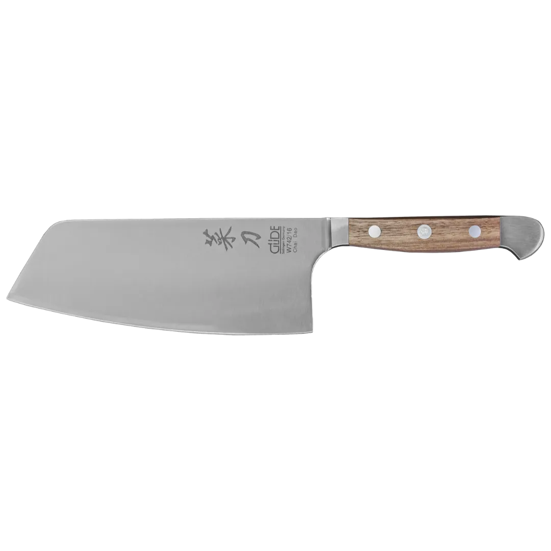 Verbessere deine Kochkünste mit dem Chai Dao Kochmesser 18 cm Alpha Walnuss von Güde. Dieses außergewöhnliche Kochmesser, inspiriert vom traditionellen chinesischen Hackbeil, vereint innovative Handwerkskunst mit praktischer Funktionalität. Die 18 cm lange Klinge aus hochwertigem Chrom-Vanadium-Molybdän-Stahl ist handgeschmiedet, rostfrei, eisgehärtet und sorgfältig handgeschärft, um herausragende Leistung zu bieten. Mit einer Klingendicke von 1,9 mm und einer Höhe von 6,6 cm ist es ideal zum Schneiden, Hacken und Zerkleinern von Fleisch, Fisch, Gemüse und Obst.