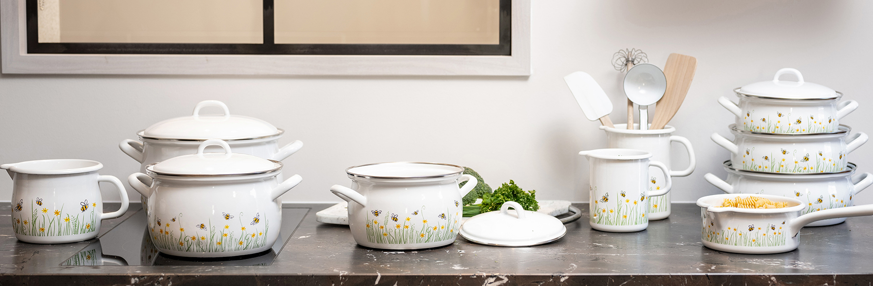 Der Werkstoff Emaille besteht aus Eisen, das bei hohen Temperaturen mit Glas verschmolzen wurde. Diese Produkte aus Emaille können auf allen Herdarten (Gas, Elektro, Glaskeramik, Induktion und sogar über offenem Feuer) verwendet werden. Danke ihres Eisenkerns leitet die Emaille die Wärme blitzschnell und speichert sie nachhaltig für ein energiesparendes Kochen. Perfekte Hygiene dank der porenlos, glatten Oberfläche aus Glas. Emaillegeschirr wird außerdem für Nickelallergiker empfohlen.