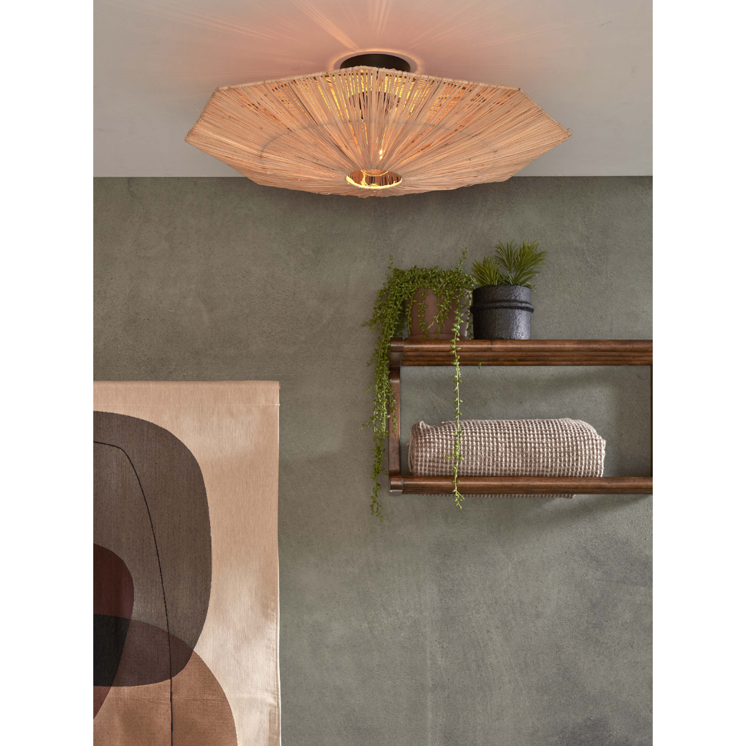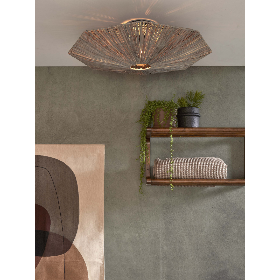 Hol Dir natürliche Eleganz nach Hause mit der GOOD&MOJO Deckenlampe Panama Octogon L – ein echtes Statement für alle, die bewusst wohnen. Mit ihrem flachen Profil von nur 7 cm Höhe und dem großzügigen, handgeflochtenen Lampenschirm aus Bast (65 cm Durchmesser) bringt sie Wärme und Struktur in jeden Raum. Du kannst aus drei harmonischen Farben wählen: Braun, Grau oder Natur.