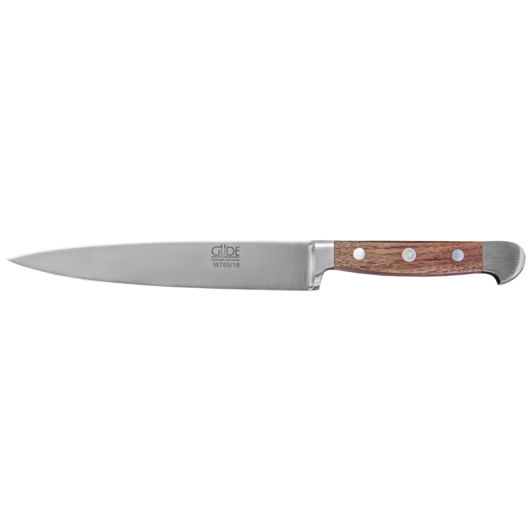 Das Güde Filiermesser überzeugt mit einem luxuriösen Griff aus amerikanischem Walnussholz, bekannt für seine schöne Maserung und den angenehmen Griff. Der ergonomisch geformte und ausgewogene Griff verbessert die Kontrolle und reduziert die Ermüdung der Hand. Die drei Nieten des Messers bestehen aus Edelstahl, wobei die “Palm-Niete” aus Aluminium Güdes Handwerkskunst symbolisiert. Mit einer Gesamtlänge von 30,6 cm und einem Gewicht von 164 Gramm bietet dieses Messer das perfekte Gleichgewicht für präzises Schneiden. Als preisgekröntes und sorgfältig verarbeitetes Messer kombiniert das Güde Filiermesser Alpha Walnuss Funktionalität und Eleganz und ist ein herausragendes Werkzeug für jede Küche.