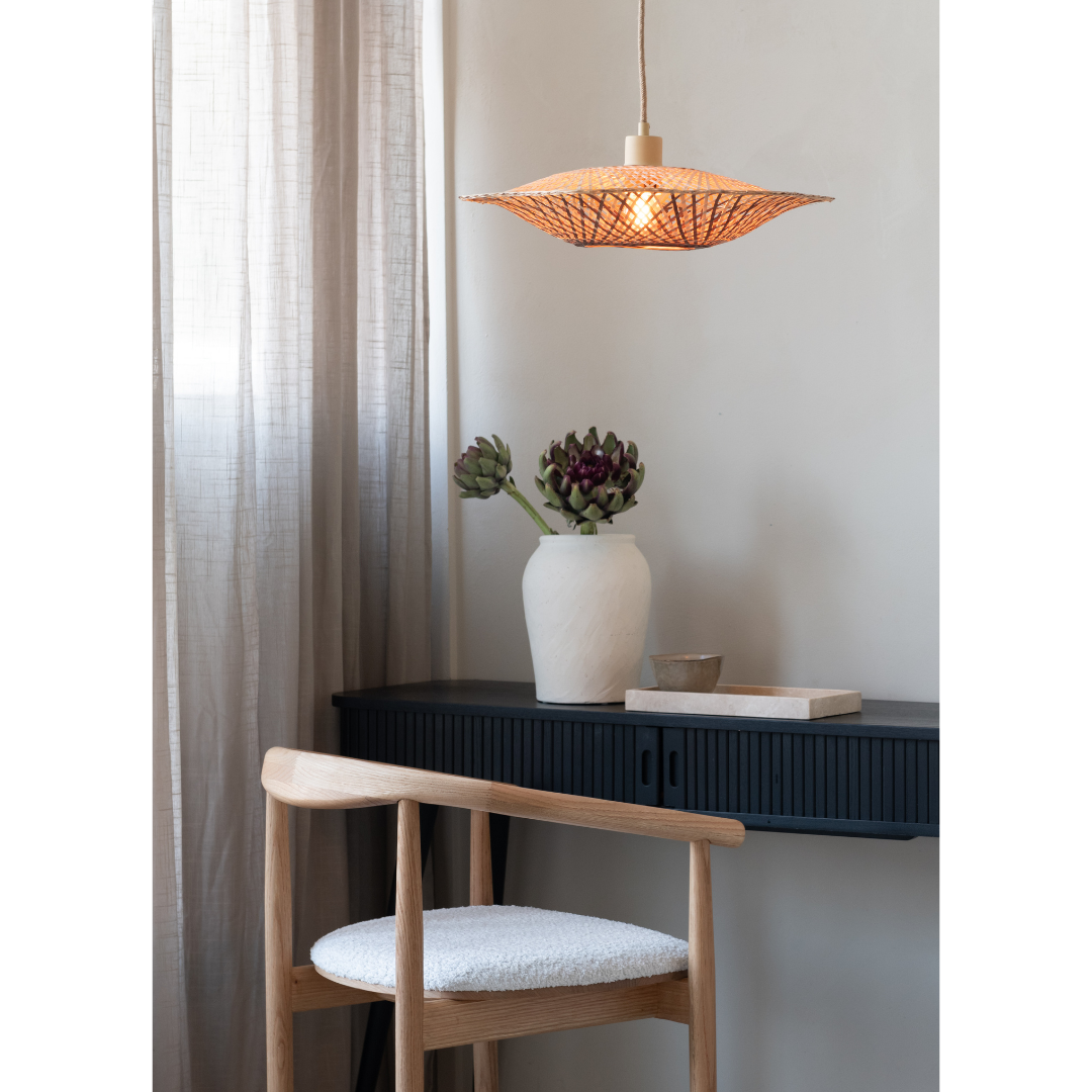 Hol Dir mit der Hängelampe Madura ø44x12cm S von GOOD&MOJO ein Stück Natürlichkeit und stilvolle Gemütlichkeit nach Hause. Der handgefertigte Lampenschirm aus nachhaltigem Bambus sorgt für eine warme Lichtstimmung und macht sich perfekt über Deinem Esstisch, in der Leseecke oder im Wohnzimmer. Dank der 200 cm langen Textilkabel kannst Du die Lampe flexibel positionieren – ganz so, wie es für Dich passt. Durch die höhenverstellbare Aufhängung bestimmst Du selbst, wie präsent das Licht im Raum wirken soll. Kombiniert mit einem Dimmer (nicht enthalten), lässt sich das Licht sanft regulieren – je nach Stimmung oder Tageszeit.