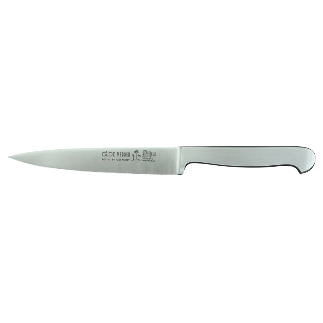 Hier ist das Güde Kappa Zubereitungsmesser 16cm – das unverzichtbare Allround-Messer für deine Küche. Dieses Messer ist vielseitig einsetzbar und sollte in keiner Kochsammlung fehlen. Hergestellt aus einem einzigen Stück Chrom-Vanadium-Molybdän Messerstahl, handgeschmiedet und durch über 30 manuelle Arbeitsschritte veredelt, bietet das Güde Zubereitungsmesser aus der Kappa Serie herausragende Qualität und Langlebigkeit.