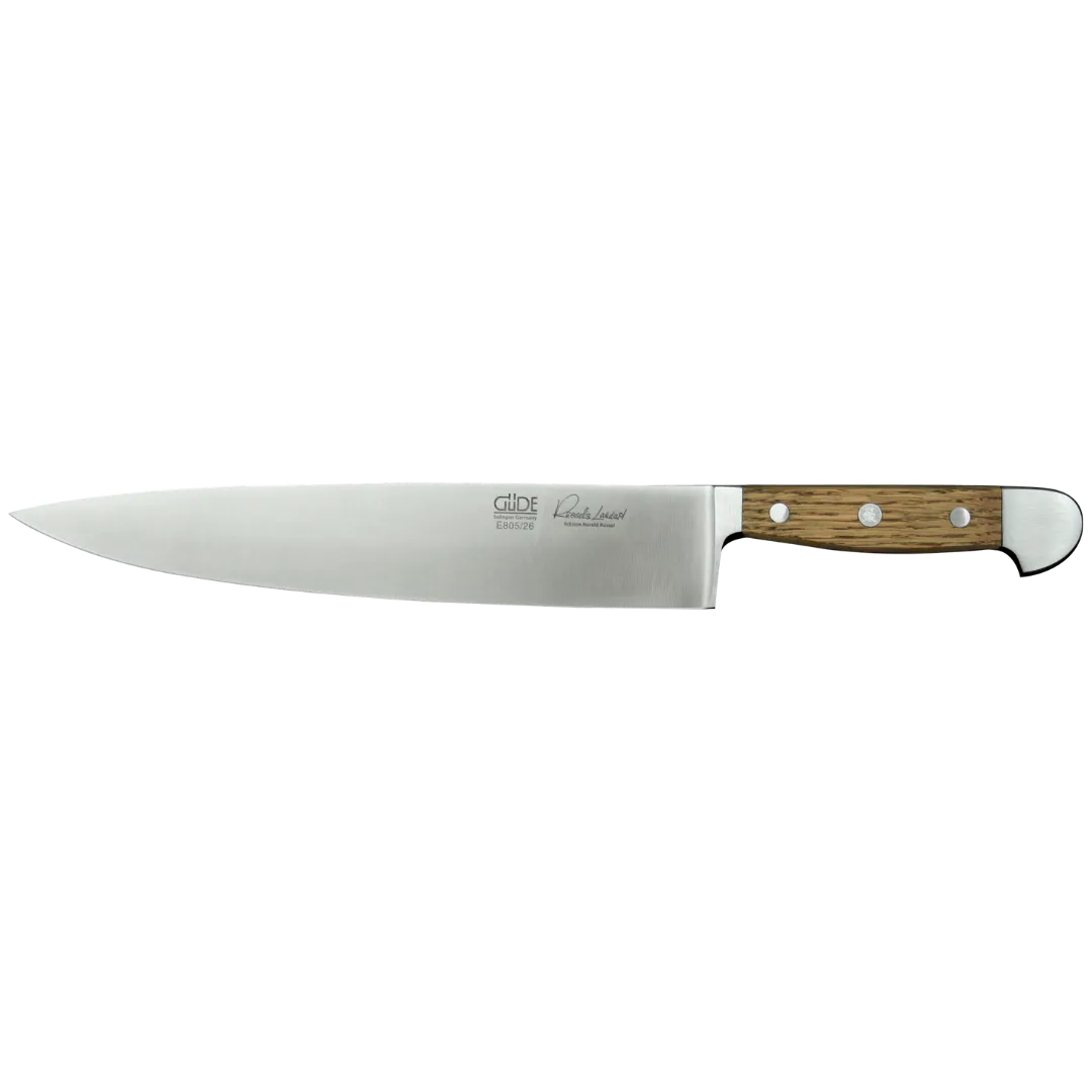 Erlebe die Vielseitigkeit vom Güde Kochmesser 26cm aus der Alpha Fasseiche-Serie, dem unverzichtbaren Werkzeug für jede Küche. Mit seiner handgeschmiedeten Klinge aus Chrom-Vanadium-Molybdän-Stahl meistert dieses Messer mühelos jede Aufgabe – vom Wiegen und Hacken bis zum Schneiden, Drücken, Formen und Transportieren. Die Klinge, aus einem Stück gefertigt, ist rostfrei, eisgehärtet und handgeschärft, was außergewöhnliche Schärfe und Langlebigkeit garantiert. Der Griff aus Eichenholz, gereift in über 80 Jahre alten Weinfässern, bietet eine nahezu unverwüstliche Haltbarkeit und eine elegante Optik. Ergänzt durch rostfreie Edelstahl-Nieten und eine Aluminium-Palmniete, vereint dieses Messer hohe Funktionalität mit zeitlosem Design. Für die Pflege solltest du das Messer von Hand waschen. Ein echtes Meisterwerk von Güde, das in keiner Küche fehlen darf!
