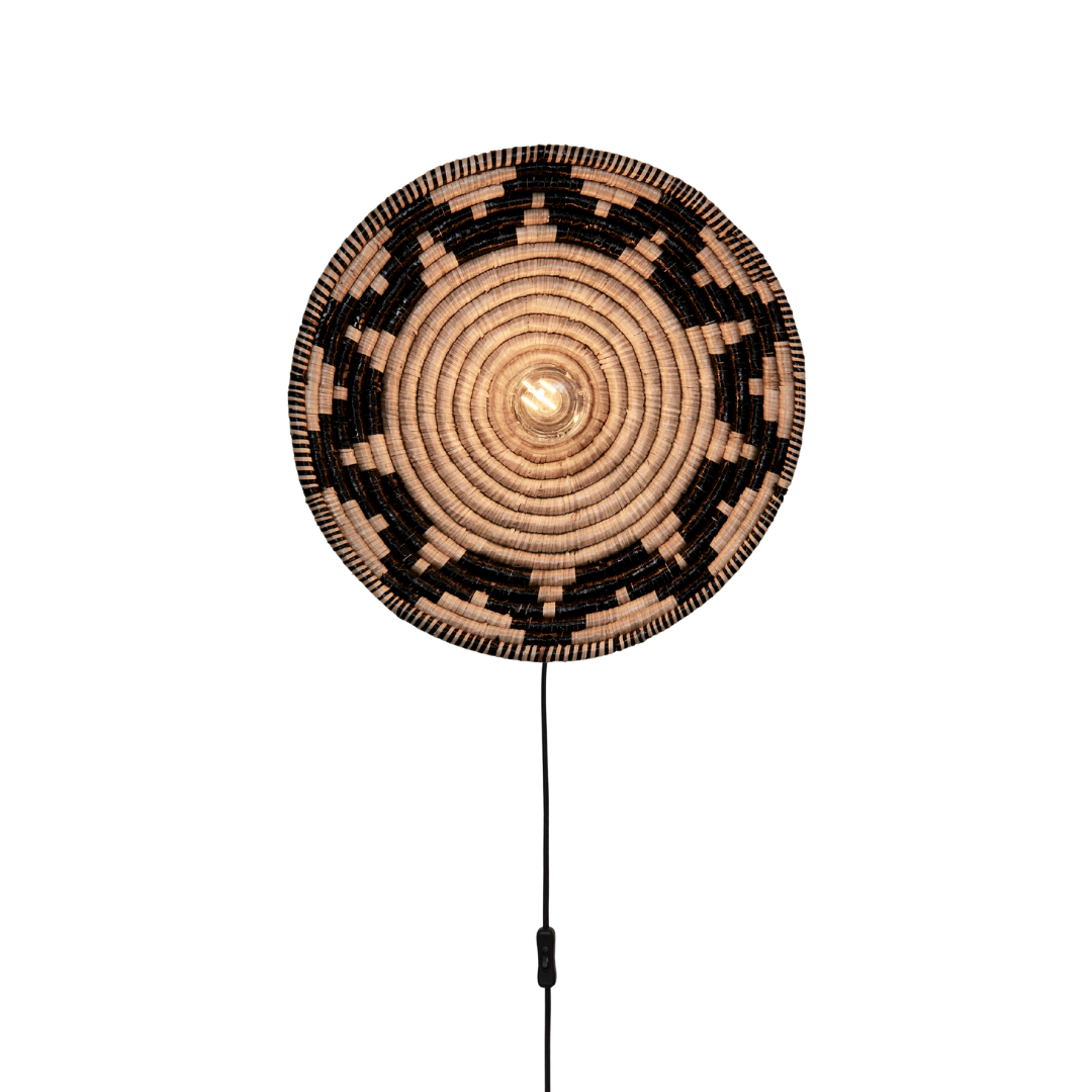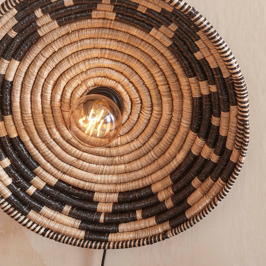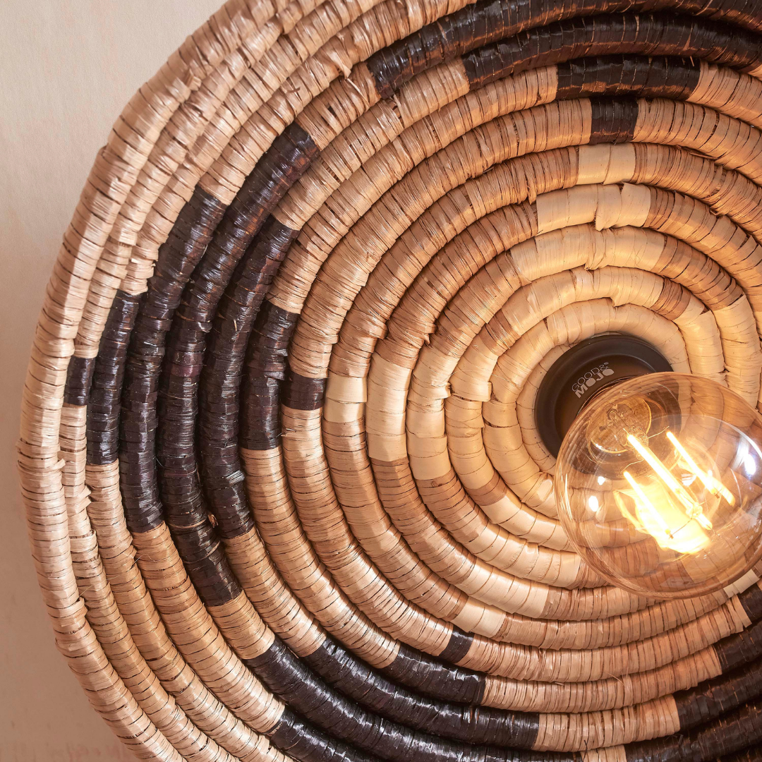Mit einem Durchmesser von 45 cm ist sie ein echter Blickfang. Das natürliche Material erzeugt ein weiches Lichtspiel und sorgt für eine entspannte Stimmung. Die Farbkombination aus Schwarz, Natur und Weiß passt wunderbar zu modernen oder rustikalen Einrichtungen.